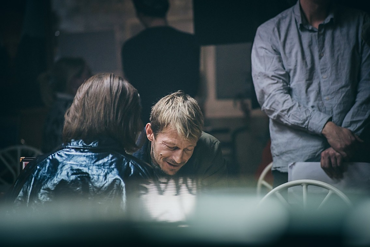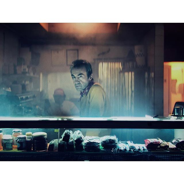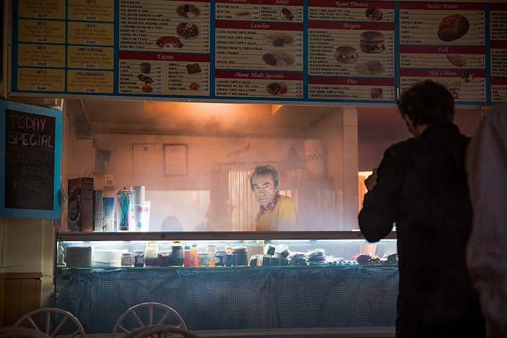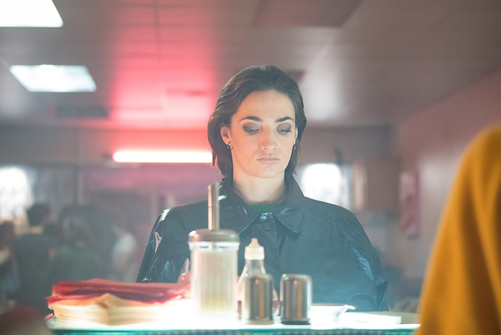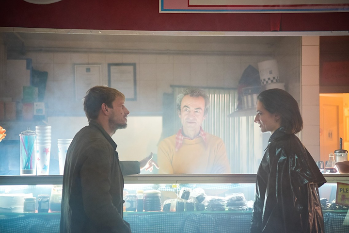 In a 24/7 burger place, a man engages in a flirtatious conversation with a woman with no arms, as she uses him to get fed her burger one bite at a time.